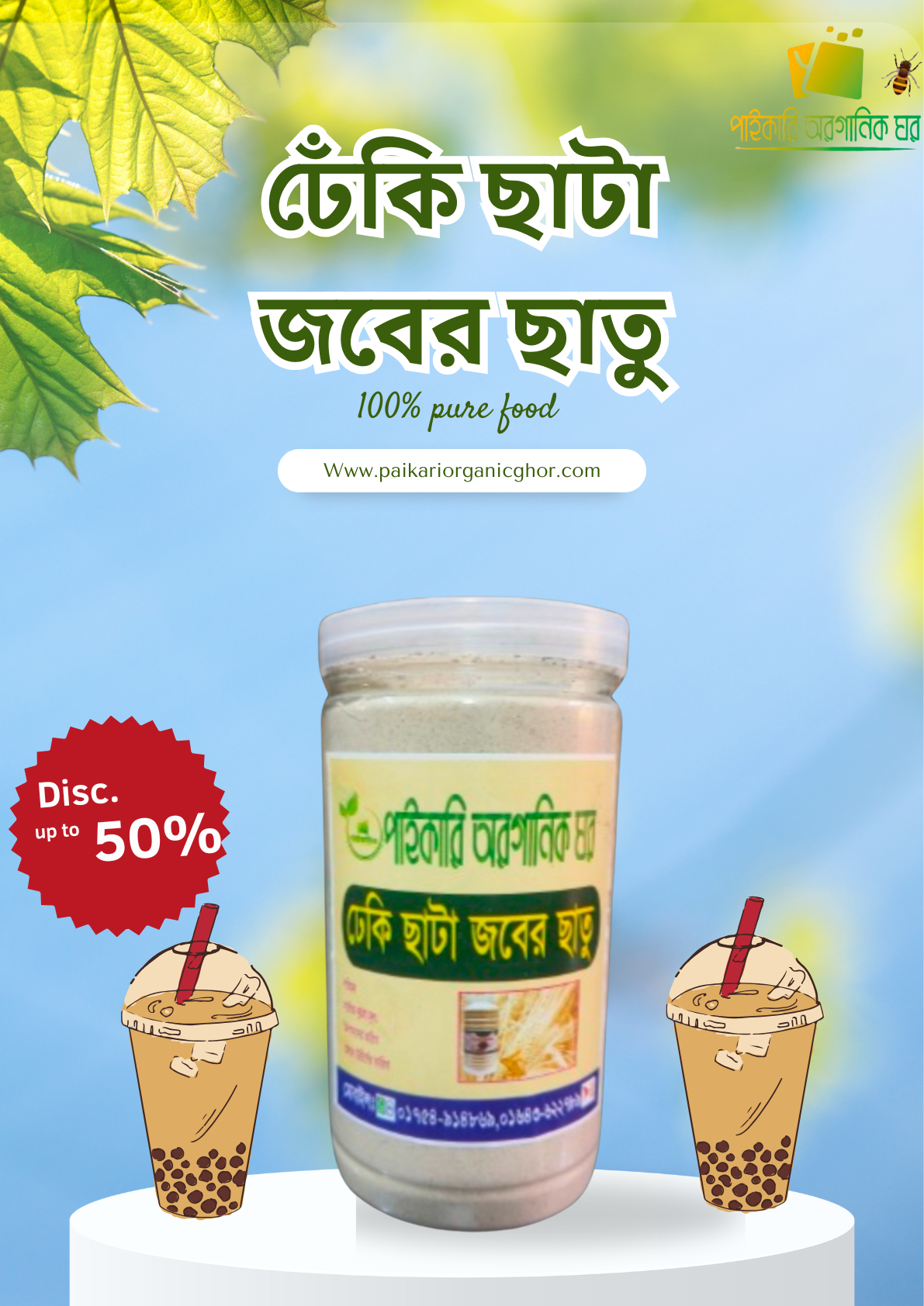 ঢেকি ছাঁটা জবের ছাতু একটি পুষ্টিকর ও স্বাস্থ্যকর খাদ্য উপাদান, যা সম্পূর্ণ প্রাকৃতিক প্রক্রিয়ায় প্রস্তুত করা হয়। এটি প্রচলিত মেশিনে ছাঁটা ছাতুর তুলনায় বেশি সুস্বাদু ও সহজেই হজমযোগ্য।